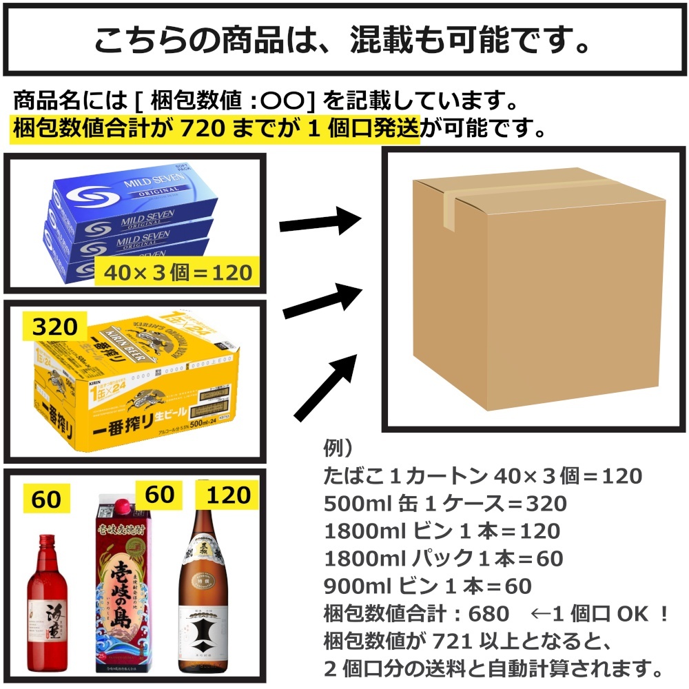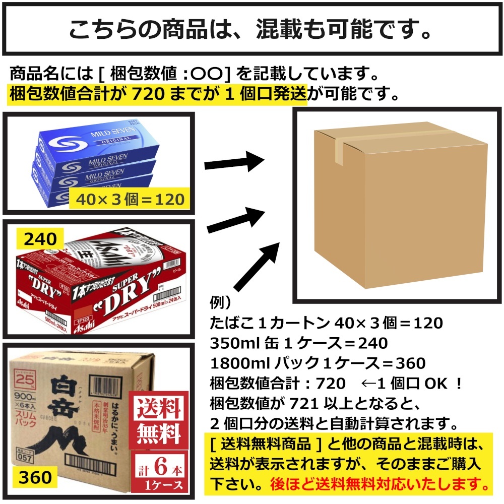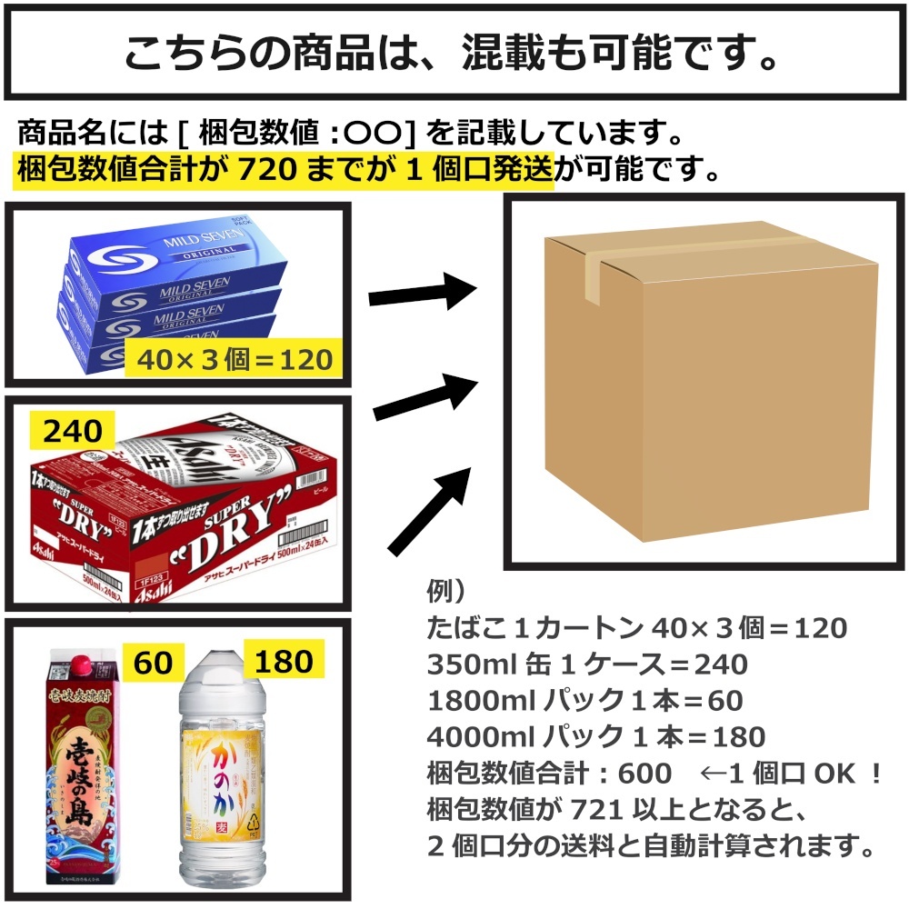 350ml缶は、梱包数値が240の為、3ケースだと720となり1個口となります。4ケースだと2個口になる仕組みです。