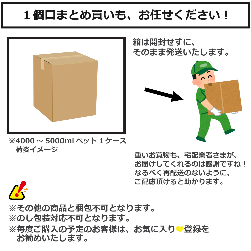※900mlビン1ケース、4リットル1ケースなど、その商品のみで混載できない商品もあります。